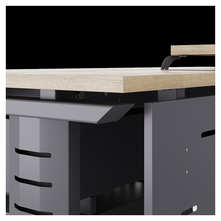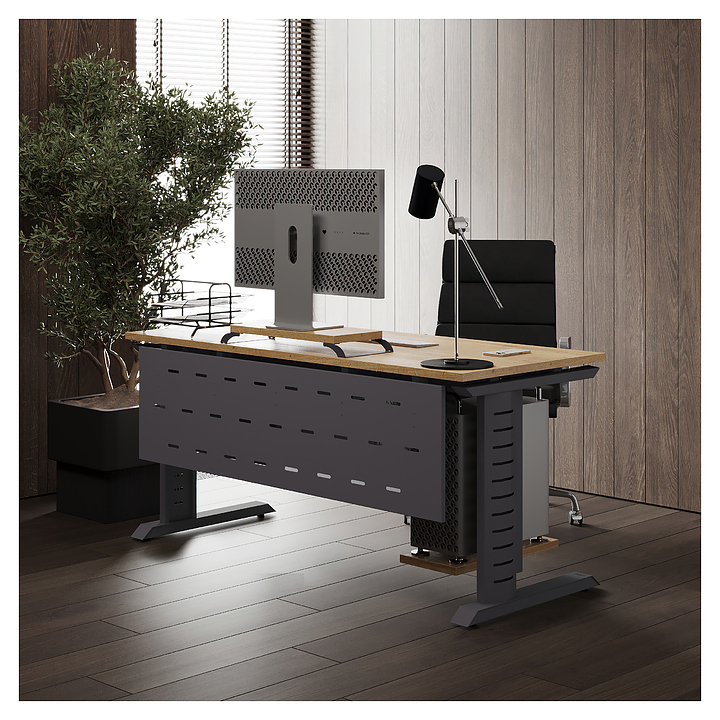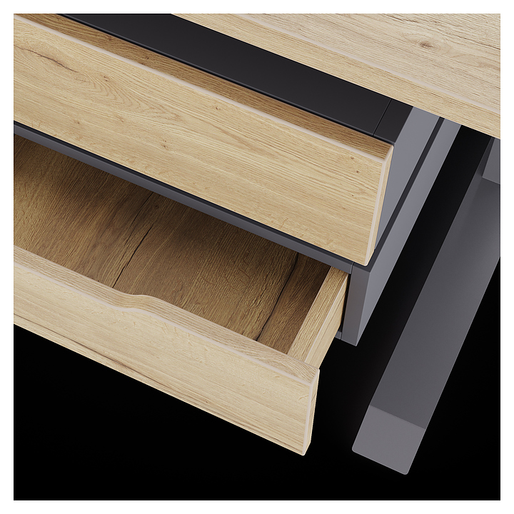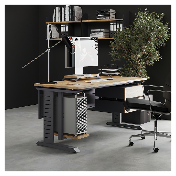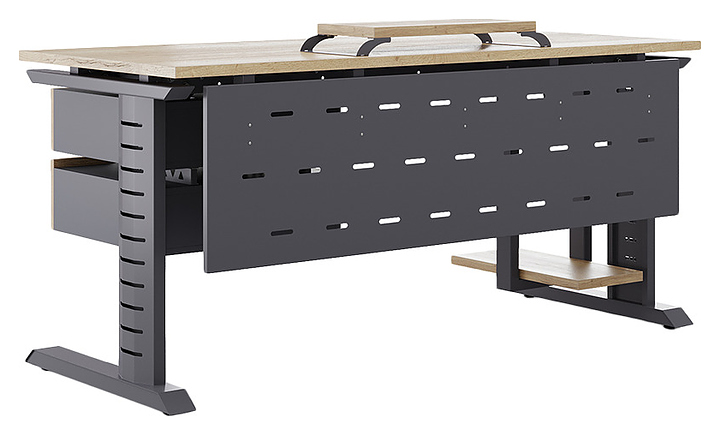 Компьютерный стол Кобор KL2-80/70 graphite/natural используется в офисных помещениях и кабинетах руководителей. Модель оснащена L-образными опорами с декоративными вставками на боковинах. Каркас выполнен из металла, выкрашенного в цвет графит муар (RAL7024), столешница – из ламинированной древесно-стружечной плиты (ЛДСП) цвета натуральный дуб (H1180 ST37). Опции (заказываются отдельно):