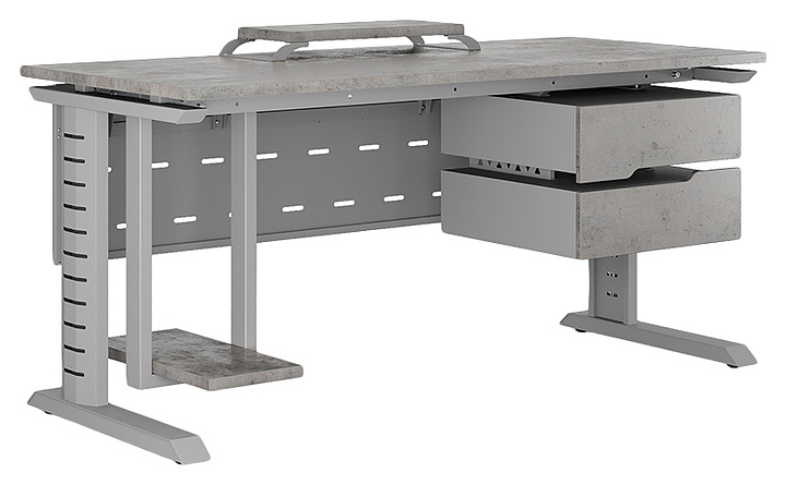 Компьютерный стол Кобор КL2-160/60 aluminum/chicago используется в офисных помещениях и кабинетах руководителей. Модель оснащена L-образными опорами с декоративными вставками на боковинах. Каркас выполнен из металла, выкрашенного в цвет алюминиевый металлик (RAL9006), столешница – из ламинированной древесно-стружечной плиты (ЛДСП) цвета бетон чикаго (F186 ST9). Опции (заказываются отдельно):