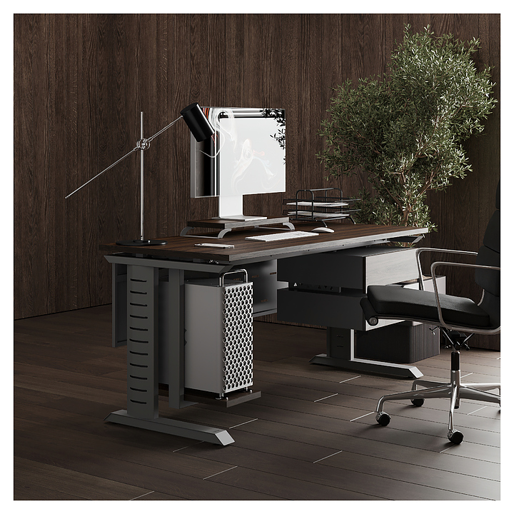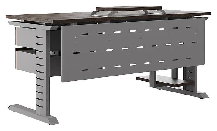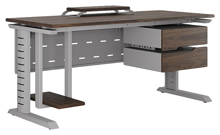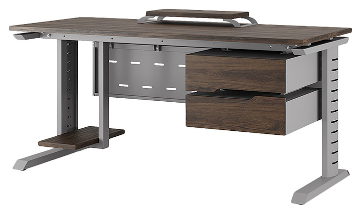 Компьютерный стол Кобор КL2-80/70 aluminum/charlston используется в офисных помещениях и кабинетах руководителей. Модель оснащена L-образными опорами с декоративными вставками на боковинах. Каркас выполнен из металла, выкрашенного в цвет алюминиевый металлик (RAL9006), столешница – из ламинированной древесно-стружечной плиты (ЛДСП) цвета дуб чарльстон (H3154 ST36). Опции (заказываются отдельно):