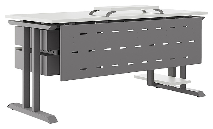 Компьютерный стол Кобор KT-180/80 aluminum/premium используется в офисных помещениях и кабинетах руководителей. Модель оснащена T-образными опорами. Каркас выполнен из металла, выкрашенного в цвет алюминиевый металлик (RAL9006), столешница – из ламинированной древесно-стружечной плиты (ЛДСП) цвета белый премиум (W1000 ST9). Опции (заказываются отдельно):