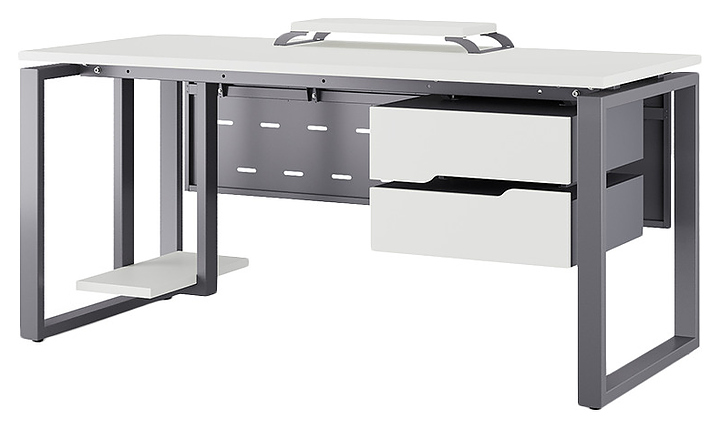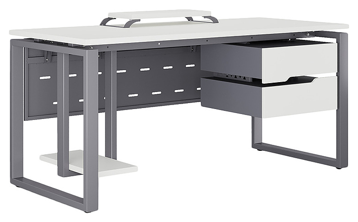 Компьютерный стол Кобор КO1-100/60 graphite/premium используется в офисных помещениях и кабинетах руководителей. Модель оснащена O-образными опорами. Каркас выполнен из металла, выкрашенного в цвет графит муар (RAL7024), столешница – из ламинированной древесно-стружечной плиты (ЛДСП) цвета белый премиум (W1000 ST9). Опции (заказываются отдельно):
