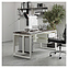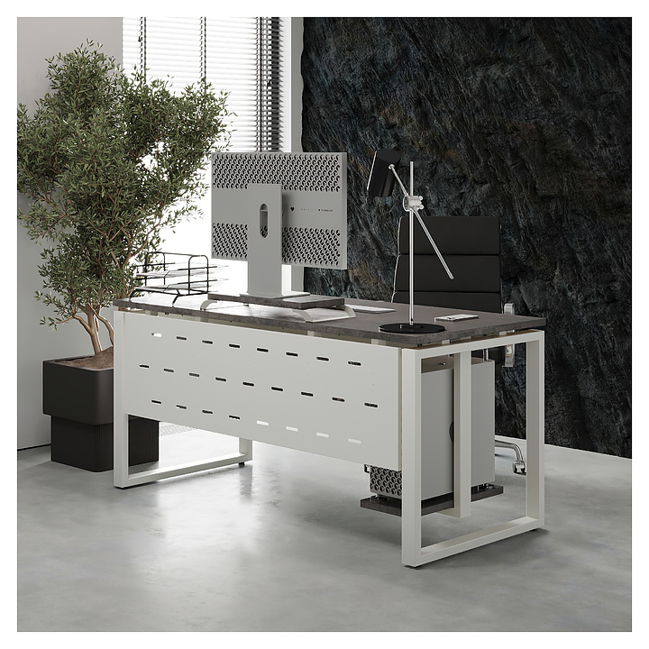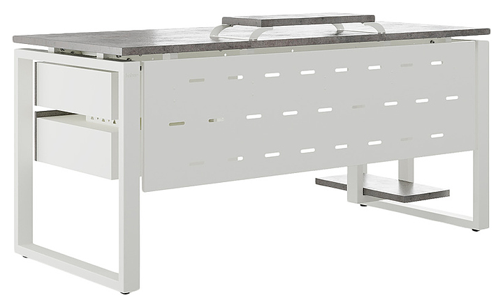 Компьютерный стол Кобор КO1-100/60 white/chicago используется в офисных помещениях и кабинетах руководителей. Модель оснащена O-образными опорами. Каркас выполнен из металла, выкрашенного в цвет белый муар (RAL9016), столешница – из ламинированной древесно-стружечной плиты (ЛДСП) цвета бетон чикаго (F186 ST9). Опции (заказываются отдельно):