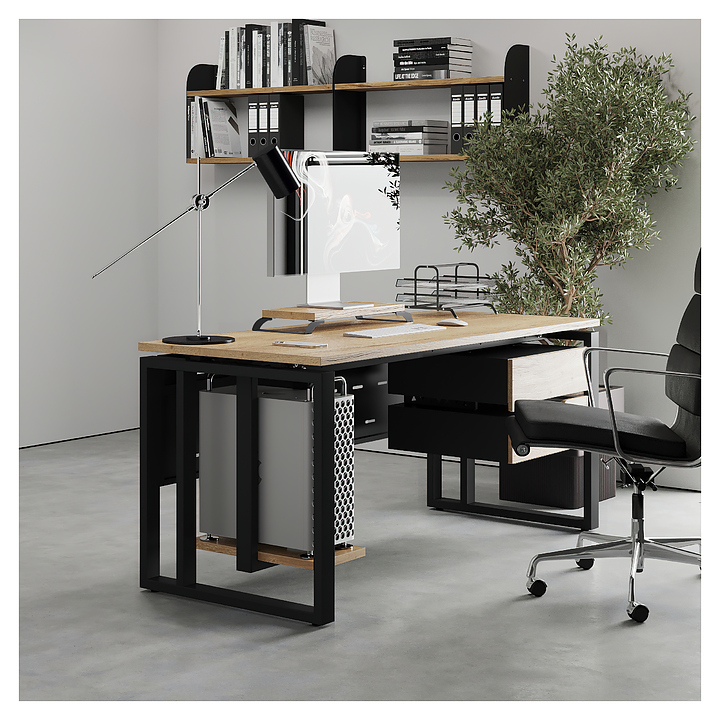 Компьютерный стол Кобор КO2-160/60 black/natural используется в офисных помещениях и кабинетах руководителей. Модель оснащена усиленными вертикальной балкой O-образными опорами. Каркас выполнен из металла, выкрашенного в цвет черный муар (RAL9005), столешница – из ламинированной древесно-стружечной плиты (ЛДСП) цвета натуральный дуб (H1180 ST37). Опции (заказываются отдельно):