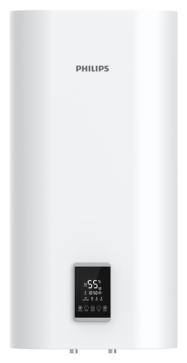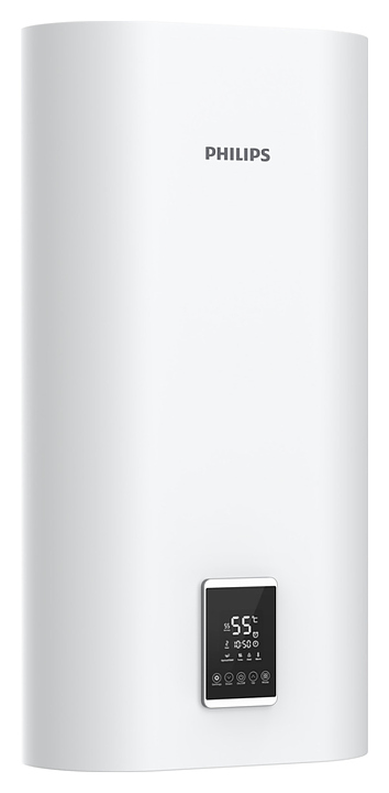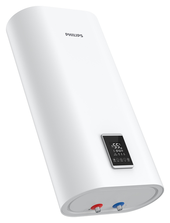 Электрический накопительный водонагреватель Philips AWH1623/51(100YC) серии UltraHeat Smart используется в местных системах водоснабжения для постоянного автономного обеспечения горячей водой одной или нескольких точек водоразбора таких как санитарные узлы, кухни в жилых и загородных частных домах, а также других бытовых и хозяйственных объектах. Модель оснащена внутренним баком, 2 трубчатыми электронагревателями (ТЭНами), расположенной на фронтальной стенке сенсорной панелью управления с цифровым светодиодным дисплеем, резьбовыми штуцерами для подвода холодной и выхода горячей воды. Вертикально ориентированный уплощенный корпус овального сечения выполнен из металла с матовым антикоррозийным покрытием белого цвета, нижняя крышка – из ударопрочного белого пластика, внутненний бак – из высококачественной нержавеющей стали, ТЭНы – из литого алюминия, термоизоляция – из пенополиуретана высокой плотности. В комплект поставки входят 2 монтажных кронштейна, 2 анкерных болта, заводская упаковка, инструкция по эксплуатации и гарантийный талон. Особенности: