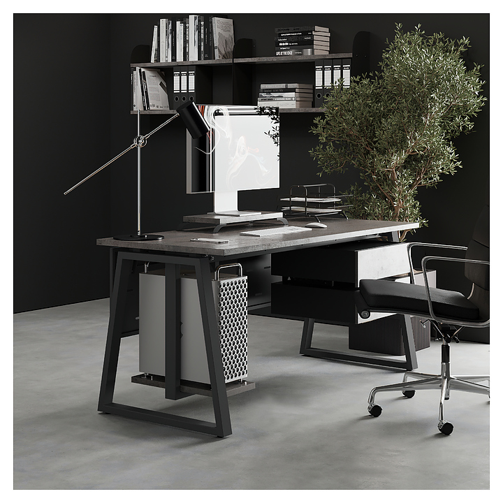 Компьютерный стол Кобор КTR-100/60 black/chicago используется в офисных помещениях и кабинетах руководителей. Модель оснащена опорами в форме трапеции. Каркас выполнен из металла, выкрашенного в цвет черный муар (RAL9005), столешница – из ламинированной древесно-стружечной плиты (ЛДСП) цвета бетон чикаго (F186 ST9). Опции (заказываются отдельно):