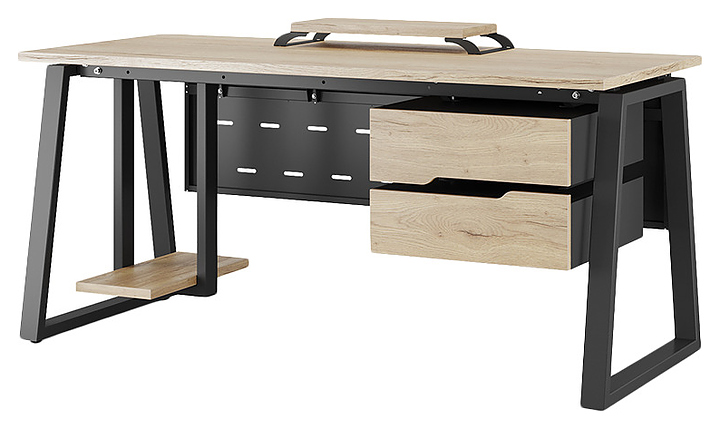 Компьютерный стол Кобор KTR-80/60 black/natural используется в офисных помещениях и кабинетах руководителей. Модель оснащена опорами в форме трапеции. Каркас выполнен из металла, выкрашенного в цвет черный муар (RAL9005), столешница – из ламинированной древесно-стружечной плиты (ЛДСП) цвета натуральный дуб (H1180 ST37). Опции (заказываются отдельно):