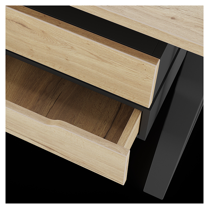 Компьютерный стол Кобор KTR-160/60 black/natural используется в офисных помещениях и кабинетах руководителей. Модель оснащена опорами в форме трапеции. Каркас выполнен из металла, выкрашенного в цвет черный муар (RAL9005), столешница – из ламинированной древесно-стружечной плиты (ЛДСП) цвета натуральный дуб (H1180 ST37). Опции (заказываются отдельно):