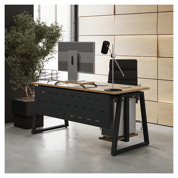 Компьютерный стол Кобор KTR-100/70 black/natural используется в офисных помещениях и кабинетах руководителей. Модель оснащена опорами в форме трапеции. Каркас выполнен из металла, выкрашенного в цвет черный муар (RAL9005), столешница – из ламинированной древесно-стружечной плиты (ЛДСП) цвета натуральный дуб (H1180 ST37). Опции (заказываются отдельно):