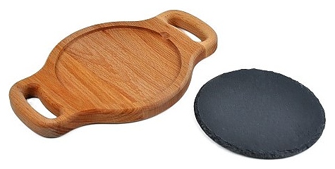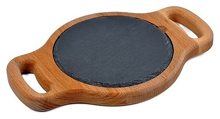 Блюдо для подачи MGprof 73120 предназначено для профессионального использования в ресторанах. Модель имеет круглую форму и оснащена ручками. Блюдо изготовлено из сланца, подставка - из дерева. Дополнительные характеристики: