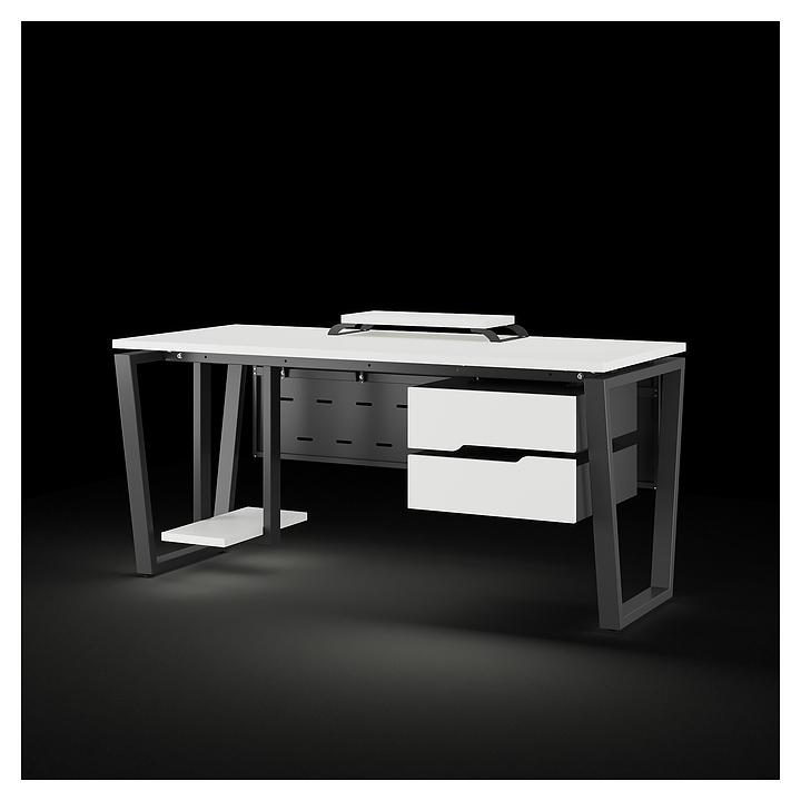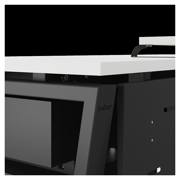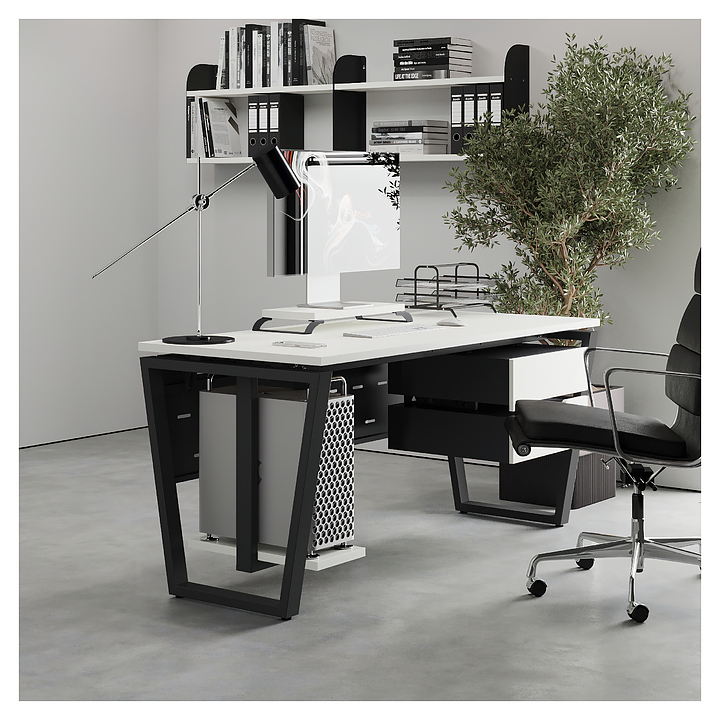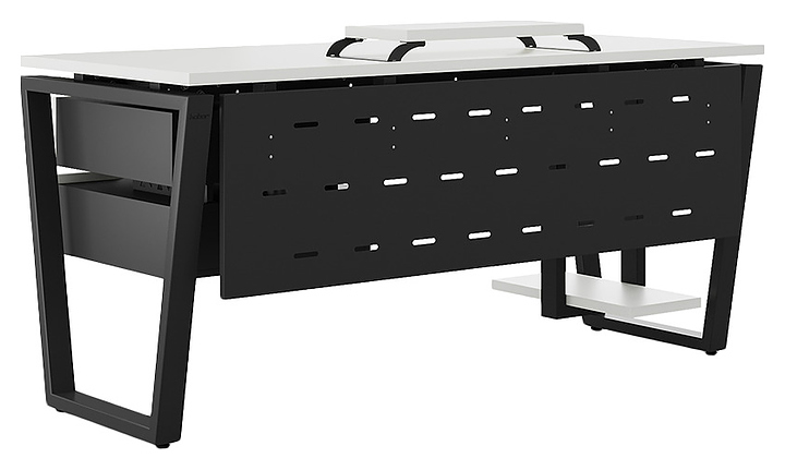 Компьютерный стол Кобор KOTR-100/60 black/premium используется в офисных помещениях и кабинетах руководителей. Модель оснащена опорами в форме обратной трапеции. Каркас выполнен из металла, выкрашенного в цвет черный муар (RAL9005), столешница – из ламинированной древесно-стружечной плиты (ЛДСП) цвета белый премиум (W1000 S9). Опции (заказываются отдельно):