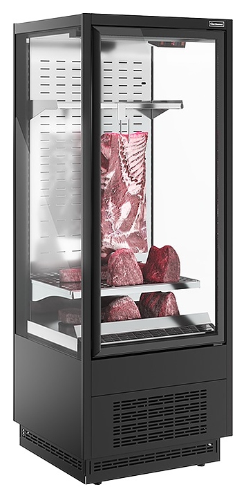Среднетемпературная холодильная горка Carboma FC 20-07 VV 0,7-1 версия 2.0 Standard серии Сube Flesh 2 используется на предприятиях общественного питания и торговли для кратковременного хранения и предпродажной демонстрации мясной продукции. Модель оснащена навесной перфорированной полкой с кронштейнами, подвесом с крюками для мяса, распашной дверью с рукояткой по всей длине створки, подставкой с фронтальной термовыводящей и цокольной решетками. Корпус прямоугольно ориентированной формы выполнен из стали с антикоррозийным покрытием внешних панелей и рам черного цвета (RAL 9005), интерьер цвета нержавеющая сталь (RAL 0430), теплоизоляция – из пенополиуретана. Особенности: