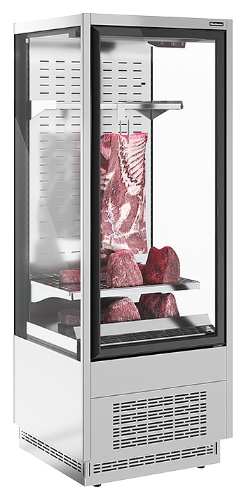 Среднетемпературная холодильная горка Carboma FC 20-07 VV 0,7-1 версия 2.0 Standard серии Сube Flesh 2 используется на предприятиях общественного питания и торговли для кратковременного хранения и предпродажной демонстрации мясной продукции. Модель оснащена навесной перфорированной полкой с кронштейнами, подвесом с крюками для мяса, распашной дверью с рукояткой по всей длине створки, подставкой с фронтальной термовыводящей и цокольной решетками. Корпус прямоугольно ориентированной формы выполнен из стали с антикоррозийным покрытием внешних панелей и интерьера цвета нержавеющая сталь (RAL 0430), теплоизоляция – из пенополиуретана. Особенности: