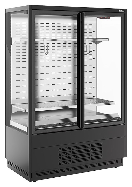 Среднетемпературная холодильная горка Carboma FC 20-07 VV 1,3-1 версия 2.0 Standard серии Сube Flesh 2 используется на предприятиях общественного питания и торговли для кратковременного хранения и предпродажной демонстрации мясной продукции. Модель оснащена навесной перфорированной полкой с кронштейнами, подвесом с крюками для мяса, 2 распашными дверьми с рукоятками по всей длине створок, подставкой с фронтальной термовыводящей и цокольной решетками. Корпус прямоугольно ориентированной формы выполнен из стали с антикоррозийным покрытием внешних панелей и рам черного цвета (RAL 9005), интерьер цвета нержавеющая сталь (RAL 0430), теплоизоляция – из пенополиуретана. Особенности: