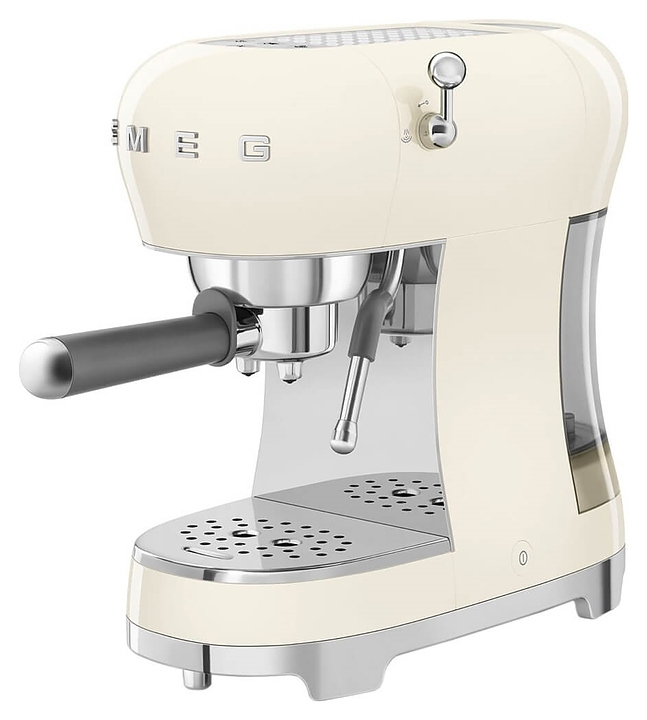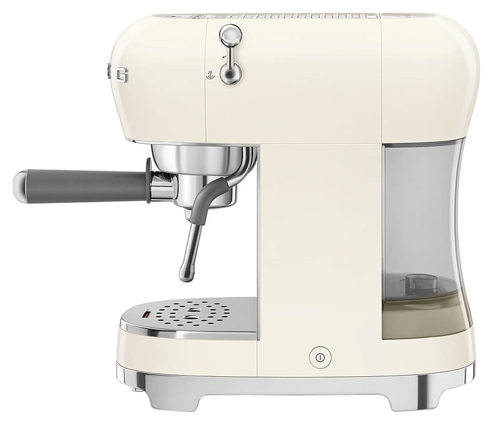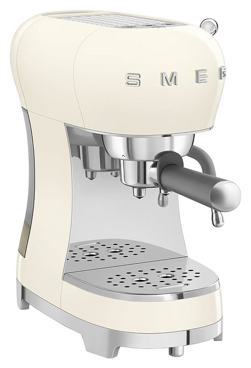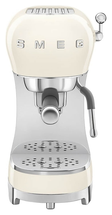 Эспрессо кофемашина SMEG ECF02CREU предназначена для приготовления кофе эспрессо и напитков на его основе в домашних условиях. Модель оснащена кабелем питания с евровилкой (Shuko) и панелью управления с нажимными кнопками. Корпусы прибора и основания подставки для чашек выполнены из пластика с внешней глянцевой поверхностью кремового оттенка, основание прибора – из пластика с покрытием цвета полированный хром, бойлер, трубка подачи горячей воды / пара, подогреватель и поддон для чашек, фильтры, корпус холдера – из нержавеющей стали, резервуар для воды – из сополимера стирола и акрилонитрила (SAN), рукоятка холдера – из серого пластика, кнопки и накладные объемные литеры логотипа – из пластика с серебристым покрытием. Комплектация: