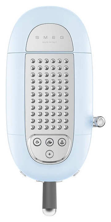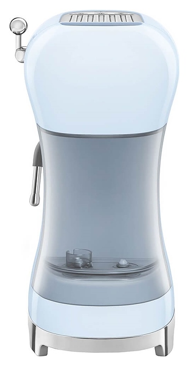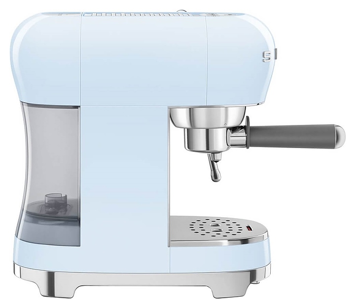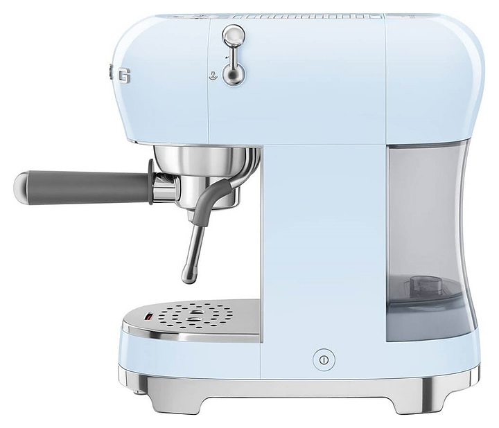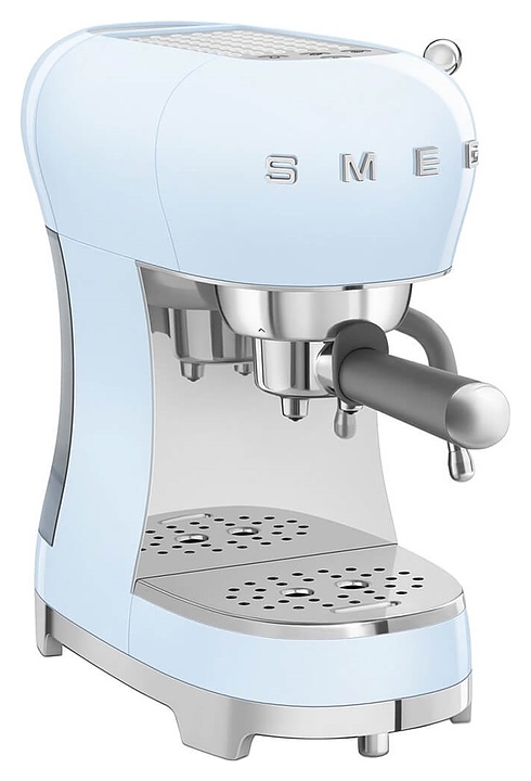 Эспрессо кофемашина SMEG ECF02PBEU предназначена для приготовления кофе эспрессо и напитков на его основе в домашних условиях. Модель оснащена кабелем питания с евровилкой (Shuko) и панелью управления с нажимными кнопками. Корпусы прибора и основания подставки для чашек выполнены из пластика с внешней глянцевой поверхностью пастельного голубого оттенка, основание прибора – из пластика с покрытием цвета полированный хром, бойлер, трубка подачи горячей воды / пара, подогреватель и поддон для чашек, фильтры, корпус холдера – из нержавеющей стали, резервуар для воды – из сополимера стирола и акрилонитрила (SAN), рукоятка холдера – из серого пластика, кнопки и накладные объемные литеры логотипа – из пластика с серебристым покрытием. Комплектация: