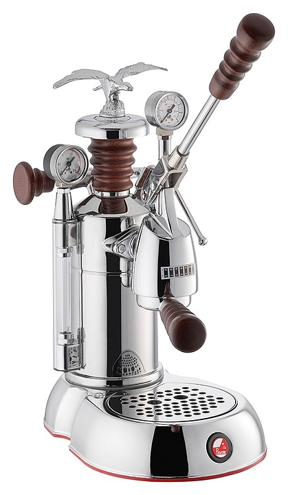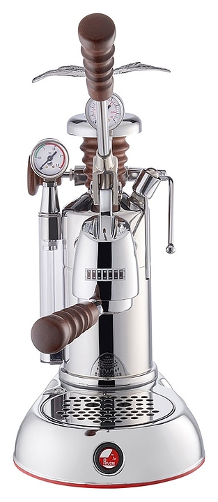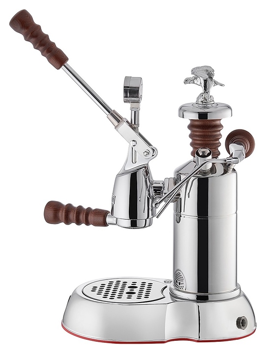 Леверная рожковая эспрессо кофемашина La Pavoni LPLESA01EU серии Esperto используется для приготовления кофе и напитков на его основе в домашних условиях. Модель оснащена ручным прессом с длинным прямым рычагом, капучинатором, подставкой для чашек, кабелем питания с евровилкой и декоративной съемной накладкой для крышки бойлера с фигуркой расправившего крылья орла. Корпус цилиндрической формы, заварочный блок, элементы капучинатора и автокапучинатора выполнены из латуни с хромированным покрытием, основание и рычаг – из стали с хромированным покрытием, темпер – из стали, накладка крышки – из металла с хромированным покрытием, поддон каплесборника – из черного пластика, рукоятки подачи пара, рычага, холдеров и крышки бойлера – из дерева с покрытием темно-коричневого оттенка, подкладка основания с дренажной заглушкой – из силикона красного оттенка. Комплектация: