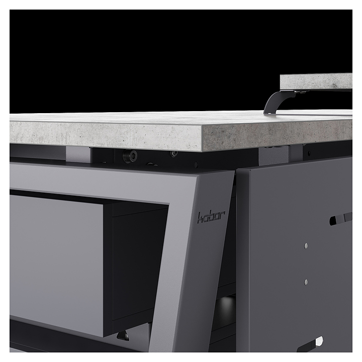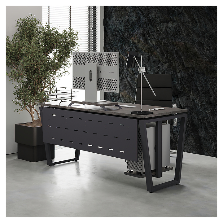Компьютерный стол Кобор КOTR-100/60 graphite/chicago используется в офисных помещениях и кабинетах руководителей. Модель оснащена опорами в форме обратной трапеции. Каркас выполнен из металла, выкрашенного в цвет графит муар (RAL7024), столешница – из ламинированной древесно-стружечной плиты (ЛДСП) цвета бетон чикаго (F186 ST9). Опции (заказываются отдельно):