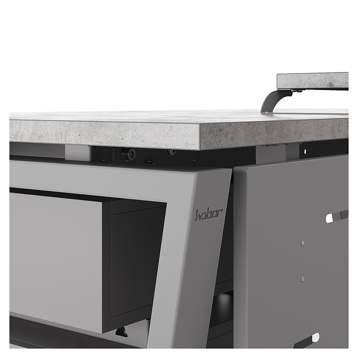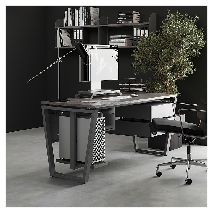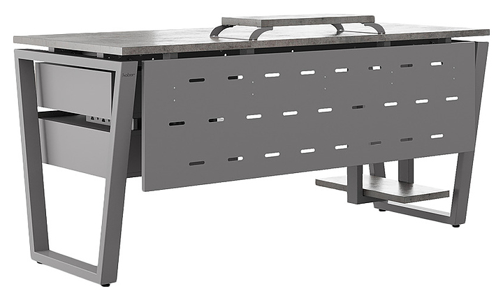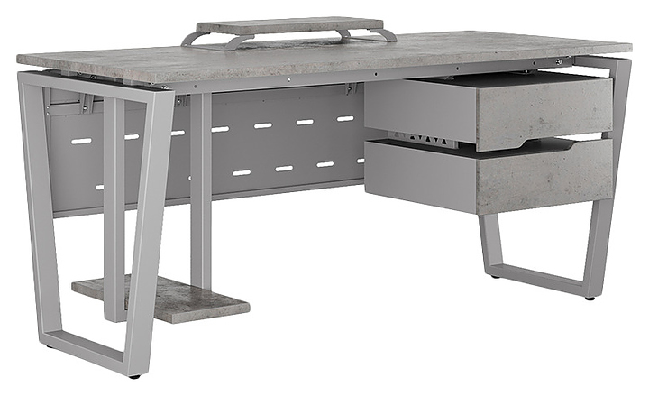 Компьютерный стол Кобор KOTR-100/60 aluminum/chicago используется в офисных помещениях и кабинетах руководителей. Модель оснащена опорами в форме обратной трапеции. Каркас выполнен из металла, выкрашенного в цвет алюминиевый металлик (RAL9006), столешница – из ламинированной древесно-стружечной плиты (ЛДСП) цвета бетон чикаго (F186 ST9). Опции (заказываются отдельно):