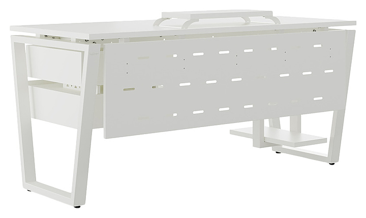 Компьютерный стол Кобор КOTR-100/60 white/premium используется в офисных помещениях и кабинетах руководителей. Модель оснащена опорами в форме обратной трапеции. Каркас выполнен из металла, выкрашенного в цвет белый муар (RAL9016), столешница – из ламинированной древесно-стружечной плиты (ЛДСП) цвета белый премиум (W1000 ST9). Опции (заказываются отдельно):