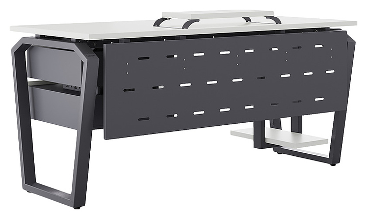 Компьютерный стол Кобор KTB-100/60 graphite/premium используется в офисных помещениях и кабинетах руководителей. Модель оснащена опорами в форме обратной трапеции со скошенными верхними углами. Каркас выполнен из металла, выкрашенного в цвет графит муар (RAL7024), столешница – из ламинированной древесно-стружечной плиты (ЛДСП) цвета белый премиум (W1000 ST9). Опции (заказываются отдельно):