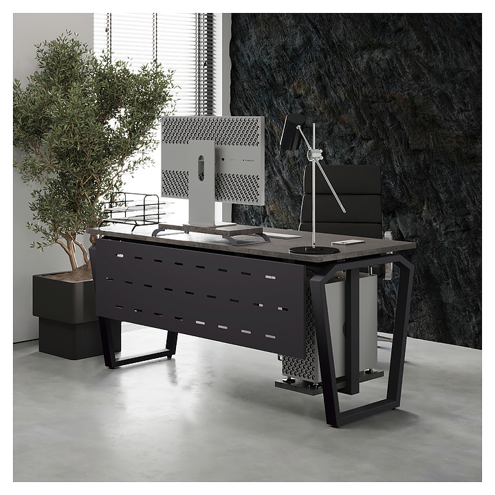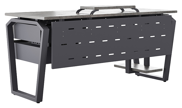 Компьютерный стол Кобор KTB-100/60 graphite/chicago используется в офисных помещениях и кабинетах руководителей. Модель оснащена опорами в форме обратной трапеции со скошенными верхними углами. Каркас выполнен из металла, выкрашенного в цвет графит муар (RAL7024), столешница – из ламинированной древесно-стружечной плиты (ЛДСП) цвета бетон чикаго (F186 ST9). Опции (заказываются отдельно):