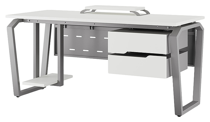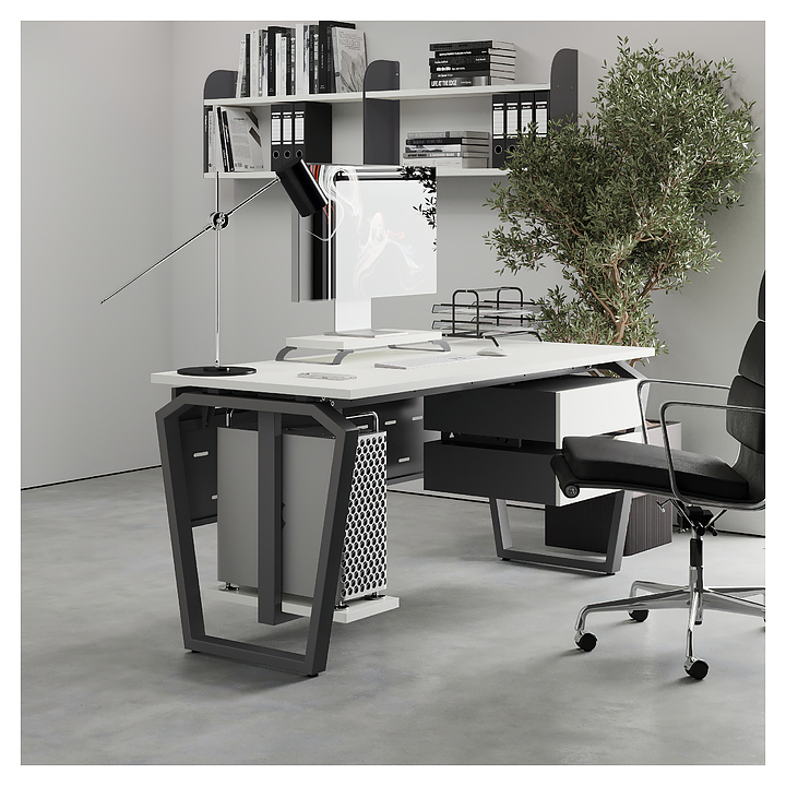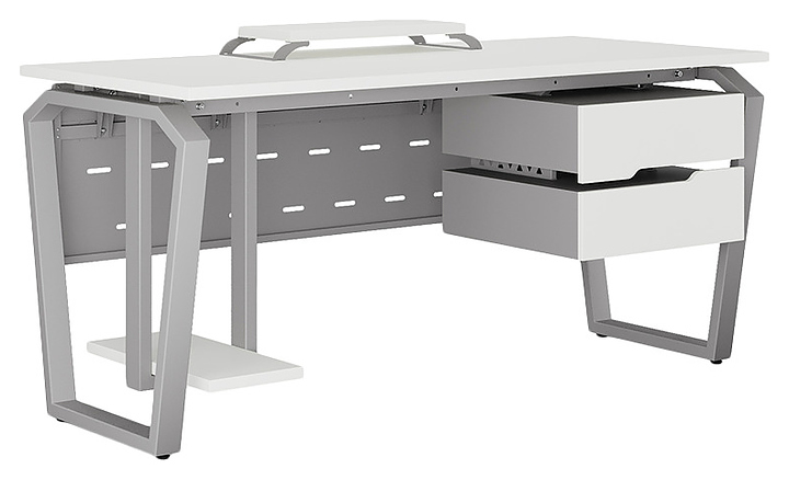 Компьютерный стол Кобор КTB-100/60 aluminum/premium используется в офисных помещениях и кабинетах руководителей. Модель оснащена опорами в форме обратной трапеции со скошенными верхними углами. Каркас выполнен из металла, выкрашенного в цвет алюминиевый металлик (RAL9006), столешница – из ламинированной древесно-стружечной плиты (ЛДСП) цвета белый премиум (W1000 ST9). Опции (заказываются отдельно):