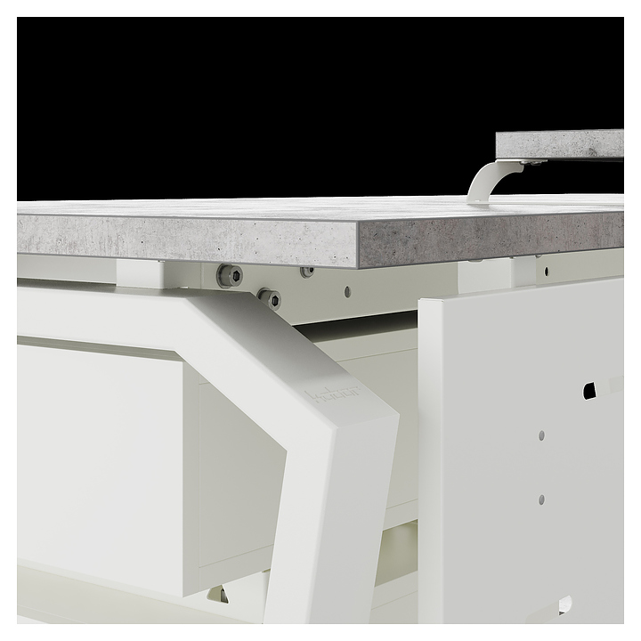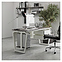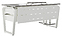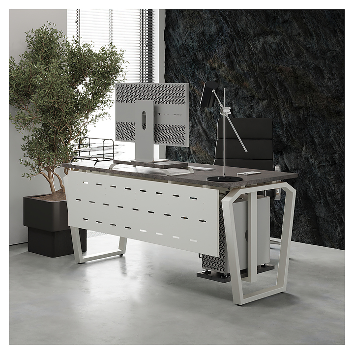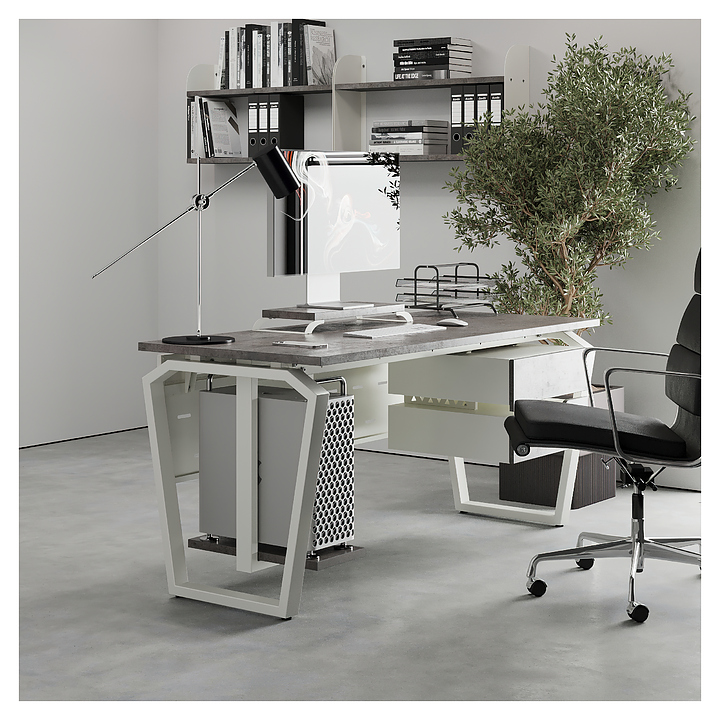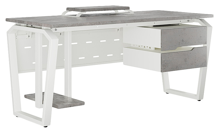 Компьютерный стол Кобор КTB-100/60 white/chicago используется в офисных помещениях и кабинетах руководителей. Модель оснащена опорами в форме обратной трапеции со скошенными верхними углами. Каркас выполнен из металла, выкрашенного в цвет белый муар (RAL9016), столешница – из ламинированной древесно-стружечной плиты (ЛДСП) цвета бетон чикаго (F186 ST9). Опции (заказываются отдельно):