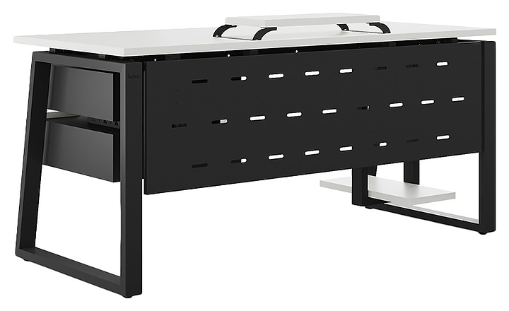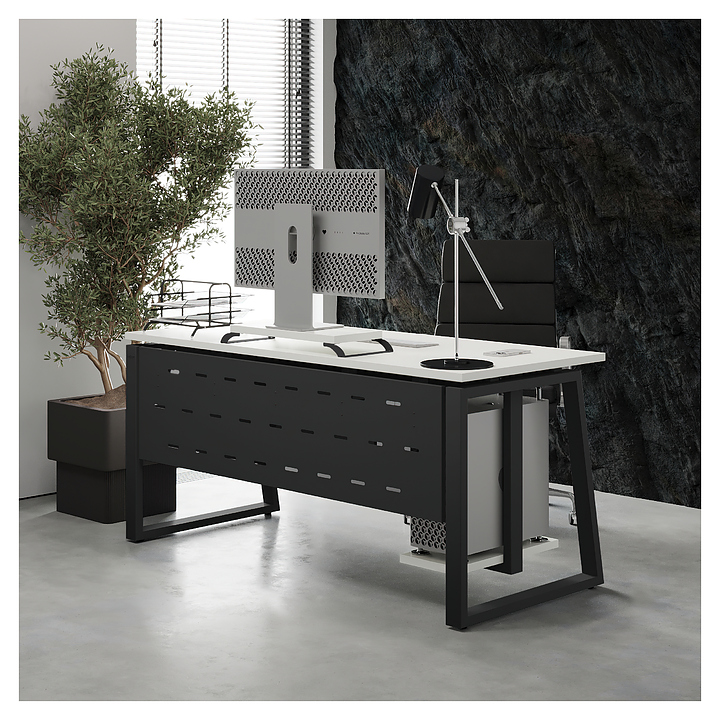 Компьютерный стол Кобор KTS1-100/60 black/premium используется в офисных помещениях и кабинетах руководителей. Модель оснащена опорами в форме наклонной трапеции. Каркас выполнен из металла, выкрашенного в цвет черный муар (RAL9005), столешница – из ламинированной древесно-стружечной плиты (ЛДСП) цвета белый премиум (W1000 S9). Опции (заказываются отдельно):