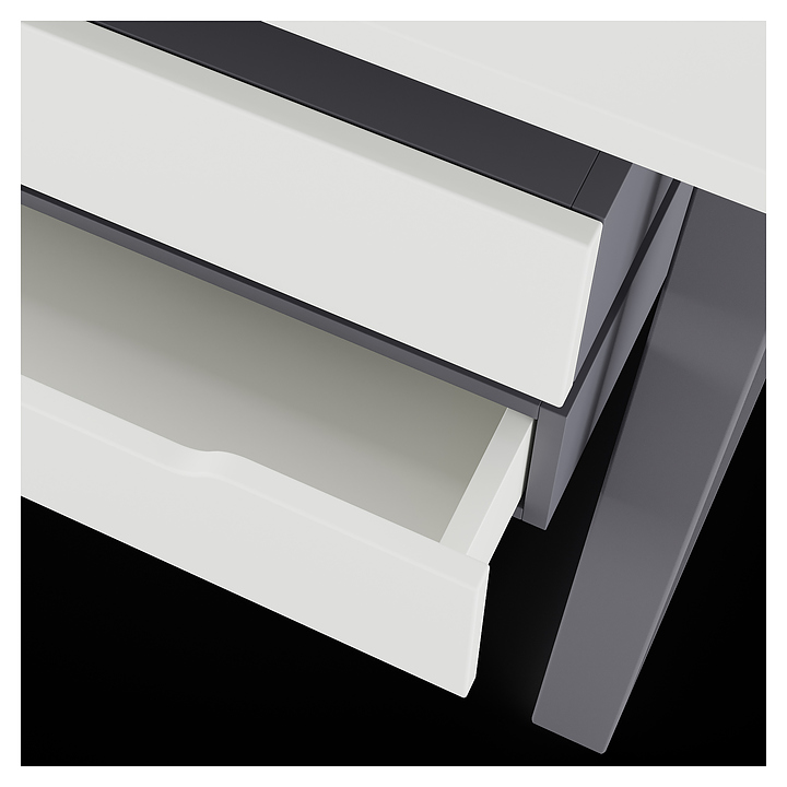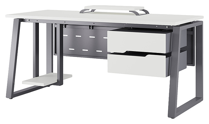 Компьютерный стол Кобор КTS1-100/60 graphite/premium используется в офисных помещениях и кабинетах руководителей. Модель оснащена опорами в форме наклонной трапеции. Каркас выполнен из металла, выкрашенного в цвет графит муар (RAL7024), столешница – из ламинированной древесно-стружечной плиты (ЛДСП) цвета белый премиум (W1000 ST9). Опции (заказываются отдельно):