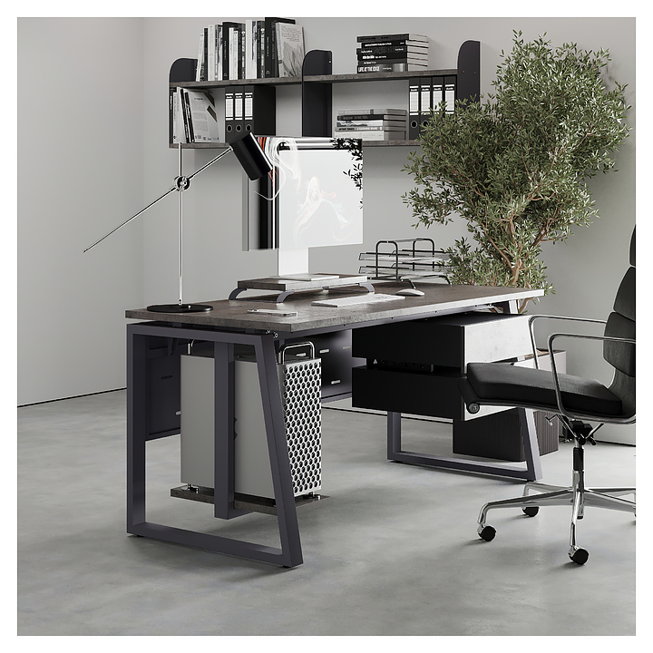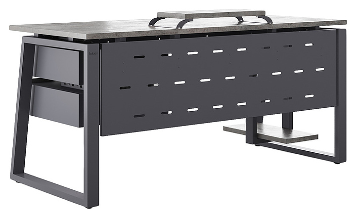 Компьютерный стол Кобор КTS1-100/60 graphite/chicago используется в офисных помещениях и кабинетах руководителей. Модель оснащена опорами в форме наклонной трапеции. Каркас выполнен из металла, выкрашенного в цвет графит муар (RAL7024), столешница – из ламинированной древесно-стружечной плиты (ЛДСП) цвета бетон чикаго (F186 ST9). Опции (заказываются отдельно):
