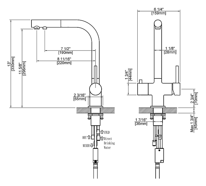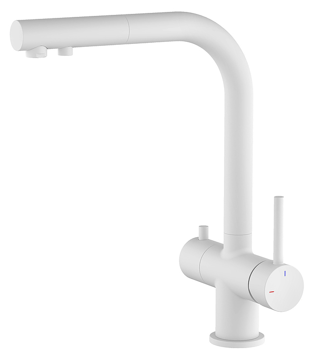 Смеситель TIMO Saona 2356/16FL предназначен для подачи горячей и холодной воды в кухонных помещениях. Модель оснащена выдвижной лейкой, подключением к фильтру и керамическим картриджем, обеспечивающим плавный ход рычага смесителя, контроль и точность при выборе напора и температуры воды. Высокий излив подходит для моек с двумя чашами, а также позволяет справляться с мытьем габаритной посуды. Вертикальное расположение рычага смесителя позволяет не задевать ручкой за стеновые панели, фартук и предметы, которые находятся за смесителем. Изделие выполнено из латуни, отличающейся прочностью, долговечностью и устойчивостью к перепадам температур. В комплект поставки входят 3 гибкие подводки, шланг лейки, адаптер для соединения с трубкой фильтра, гайка с фиксирующими винтами, 2 резиновых и 1 металлическое кольца Дополнительные характеристики: