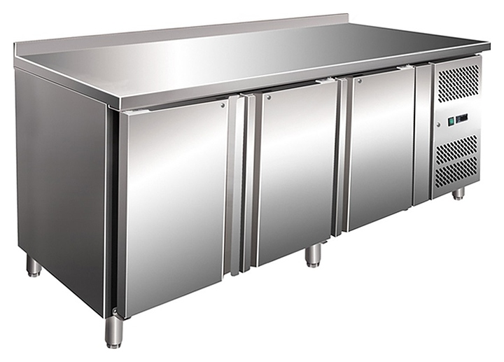 Холодильный стол Koreco GN/3100TN/W предназначен для обработки ингридиентов и кратковременного хранения предварительно охлажденных пищевых продуктов на предприятиях общественного питания и торговли. Модель оснащена расположенным справа встроенным холодильным агрегатом, 3 холодильными секциями с распашными дверьми, столешницей с бортом и электронным блоком управления. Корпус выполнен из высококачественной нержавеющей стали марки AISI201, полки – из металла с полимерным покрытием. В комплект поставки входят 3 решетчатые полки. Особенности: