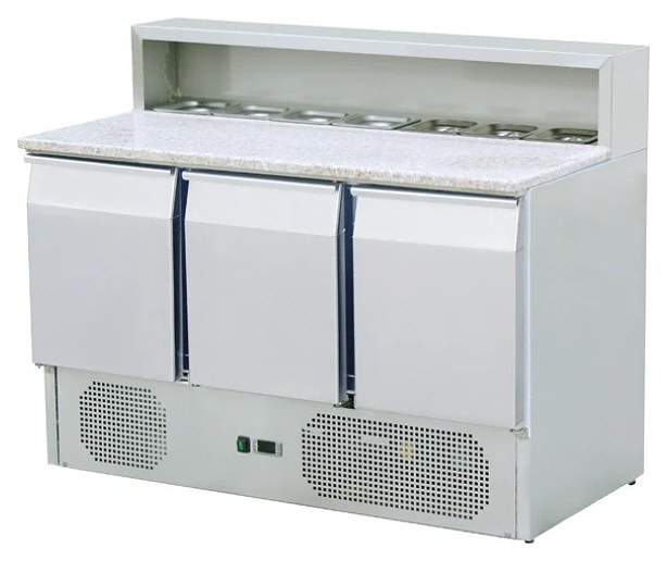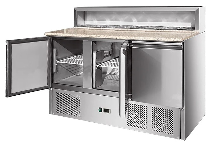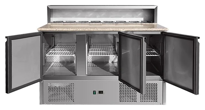Холодильный стол Koreco PS/903 предназначен для обработки ингридиентов для пиццы и кратковременного хранения предварительно охлажденных пищевых продуктов на предприятиях общественного питания и торговли. Модель оснащена расположенным снизу встроенным холодильным агрегатом, 3 холодильными секциями с распашными дверьми, салат-баром с внешней полкой и электронным блоком управления. Корпус выполнен из высококачественной нержавеющей стали марки AISI201, столешница – из гранита, полки – из металла с полимерным покрытием. В комплект поставки входят 3 решетчатые полки. Особенности: