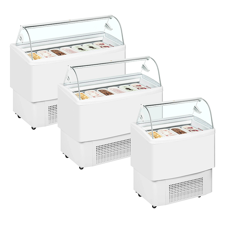 Напольная морозильная витрина TEFCOLD FIJI 4 предназначена для эффектной демонстрации и кратковременного предпродажного хранения порционных мороженого, сорбетов и других холодных десертов в гастроемкостях на предприятиях общественного питания и торговли. Модель оснащена подставкой с встроенным компрессорным агрегатом, наклонной экспозиционной поверхностью и обзорным остеклением с плавно нисходящим выпуклым фронтом. Внутренняя облицовка и экстерьер корпуса выполнены из пластифицированной стали белого цвета, задняя остекление – из прозрачного закаленного стекла, задняя створка – из прозрачного акрила, теплоизоляция – из пенополиуретана. Гастроемкости не входит в комплект поставки и приобретается отдельно. Особенности: