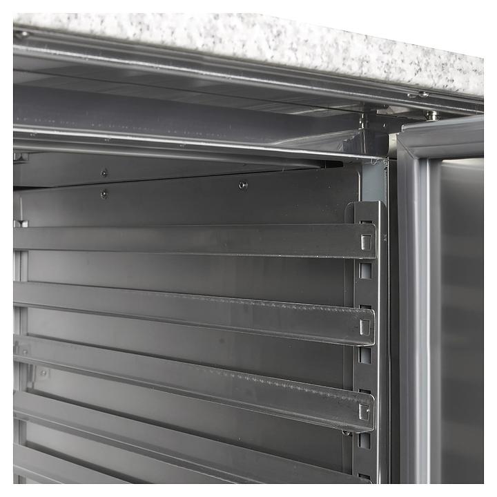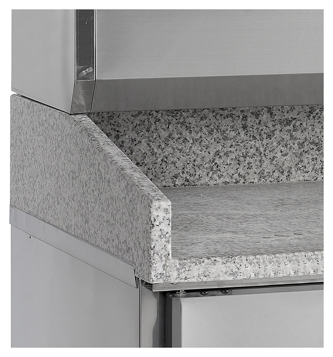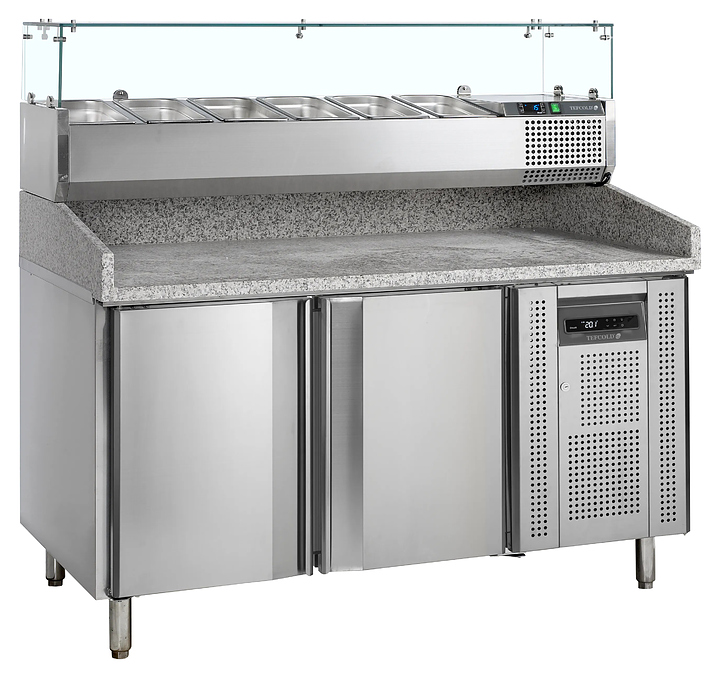 Холодильный стол TEFCOLD PT1200 + VK38-150 предназначен для обработки ингредиентов и хранения готовых топпингов, полуфабрикатов из мяса, рыбы и других продуктов для приготовления пиццы на предприятиях общественного питания и торговли. Стол оснащен расположенным справа агрегатным отсеком, столешницей с задним и боковыми бортами, 2 секциями с глухими распашными дверьми с интегрированными в боковую часть вертикальными рукоятками, 7 уровнями направляющих для противней в каждой секции и панелью управления, расположенная над столешницей витрина для гастроемкостей – агрегатным отсеком снизу, салат-баром, верхним прозрачным остеклением и панелью управления. Внутренняя облицовка и экстерьер корпусов выполнены из высококачественной нержавеющей стали марки SS304, столешница и борты – из гранита. Особенности:
