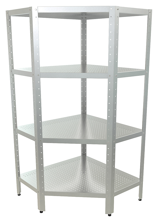 Угловой кухонный стеллаж Кобор СКПУ-6/5-90/100 предназначен для хранения посуды, различного инвентаря и сухих продуктов на предприятиях общественного питания и торговли. Модель оснащена перфорированными полками. Разборный каркас выполнен из уголка из оцинкованной стали, полки - из нержавеющей стали AISI 430. Дополнительные характеристики: