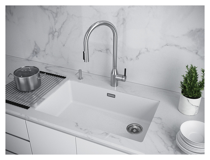 Мойка Paulmark Lumi 74UNI-SKEW LU74-WH предназначена для рационального планирования рабочего места на кухне. Модель оснащена внутренними гранями, направленными к сливу под индивидуальным углом для быстрого ухода воды. Изделие выполнено из искусственного гранита, который отличается прочностью, износостойкостью, устойчивостью к перепадам температур и механическим повреждениям, легкостью в уходе, не вступают в реакцию с продуктами и полностью безопасен для здоровья человека. В комплект поставки входят отводная арматура слив-перелив, S-образный телескопический сифон с подключением посудомоечной машины и декоративная накладка на перелив. Особенности: