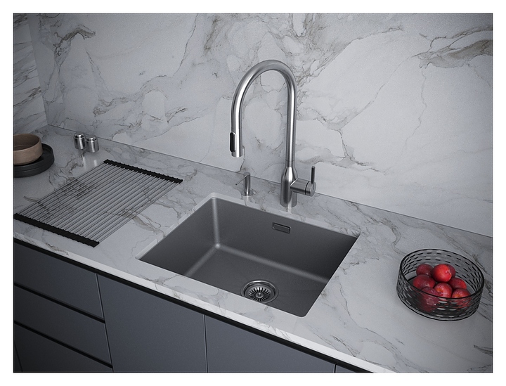 Мойка Paulmark Lumi 55UNI LU55-GRM предназначена для рационального планирования рабочего места на кухне. Модель оснащена внутренними гранями, направленными к сливу под индивидуальным углом для быстрого ухода воды. Изделие выполнено из искусственного гранита, который отличается прочностью, износостойкостью, устойчивостью к перепадам температур и механическим повреждениям, легкостью в уходе, не вступают в реакцию с продуктами и полностью безопасен для здоровья человека. В комплект поставки входят слив-перелив, S-образный телескопический сифон с подключением посудомоечной машины и декоративная накладка на перелив. Особенности: