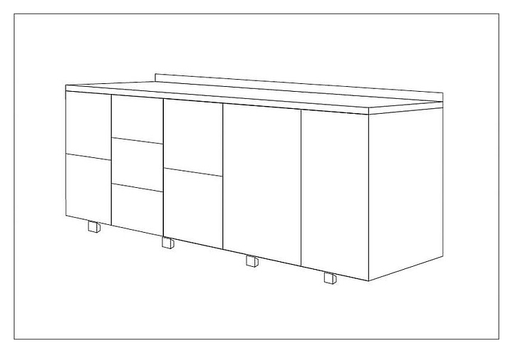• 1 секция: 2 стандартных ящика; 2 секция: 3 маленьких ящика; 3 секция: 2 стандартных ящика; 4 секция: дверь
