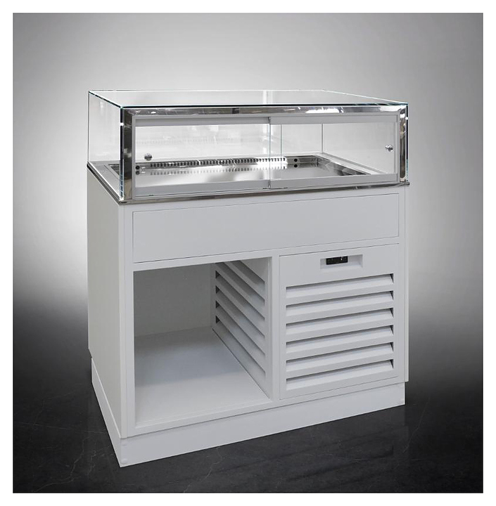 Напольная кондитерская витрина Finist GLASSIER LUX GL-8/55/3 предназначена для кратковременного хранения и предпродажной демонстрации десертов и кондитерских изделий на предприятиях общественного питания и торговли. Модель оснащена охлаждаемой камерой-накопителем, раздвижными дверьми-купе и светодиодной подсветкой. Фасады выполнены из МДФ, купол - из просветленного стекла, дно - из нержавеющей стали. Особенности: