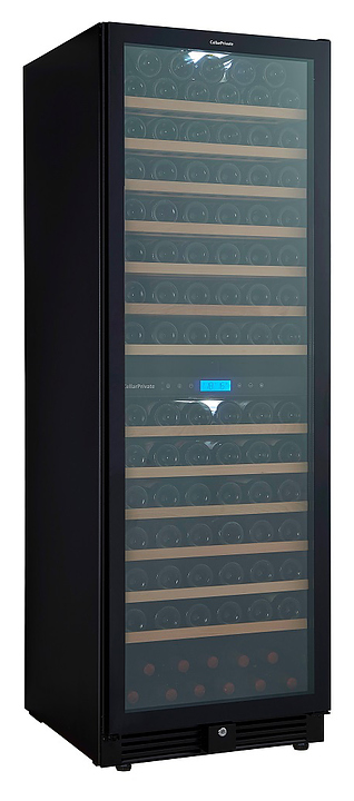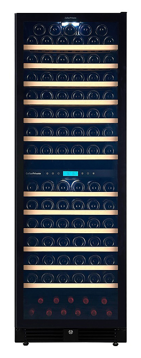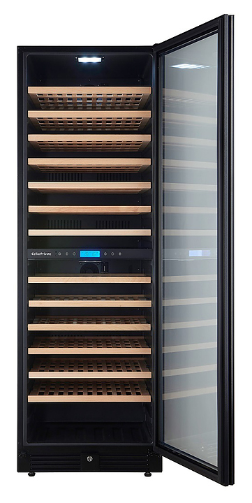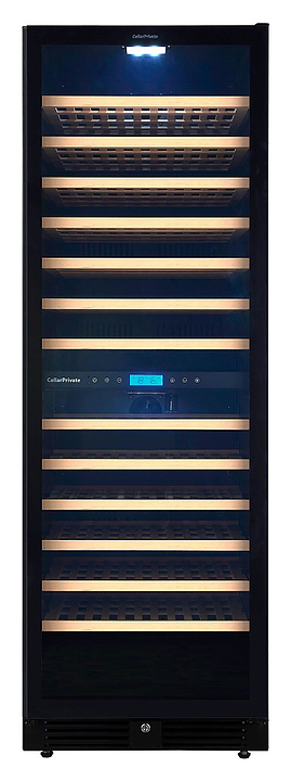 Винный шкаф Cellar Private CP165-2TBH предназначен для хранения бутилированного вина различных сортов в барах, ресторанах, специализированных магазинах, подсобных складских помещениях, а также в домашних условиях. Модель оснащена сенсорной панелью управления, которая находится внутри шкафа за дверцей, цифровым дисплеем для отображения температуры в камере и 13 съемными полками. Корпус выполнен из окрашенного металла, дверь - из металла, пластика и двойного стекла с защитой от УФ-излучения, полки - из дерева. Особенности: