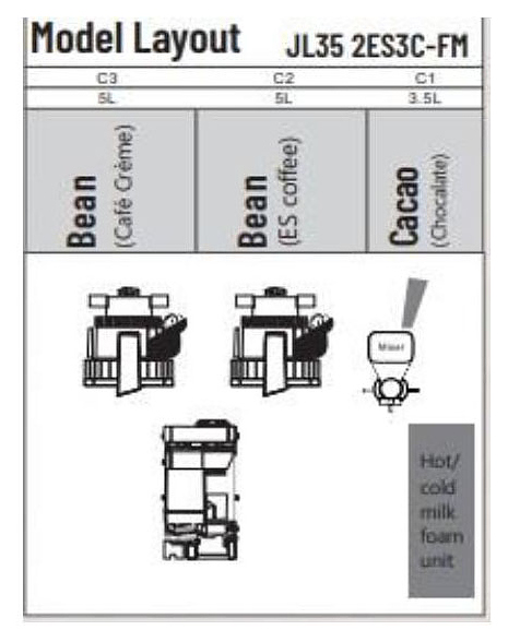 Кофемашина Jetinno JL35-2ES3C-FM предназначена для приготовления эспрессо и других кофейных напитков в кофейнях, барах, ресторанах, офисах и отелях. Модель оснащена дисплеем выбора напитков, 2 бункерами для кофейных зерен, 2 кофемолками Jetinno Patent Grinder, бункерами для растворимых ингредиентов и встроенной телеметрией. Особенности: