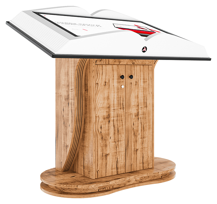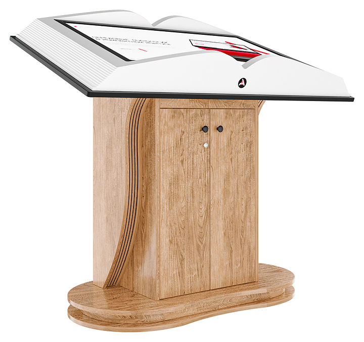 Интерактивный стол AxeTech Book Pro Medium используется для отображения информации в выставочных комплексах и музеях. Модель имеет форму раскрытой книги и оснащена инфракрасной сенсорной рамкой на 20 одновременных касаний, Wi-Fi адаптером и встроенной аудиосистемой. Стол может быть дополнен информационным приложением или интерактивной книгой с эффектом пролистывания страниц. Корпус выполнен из МДФ и ЛДСП. Особенности: