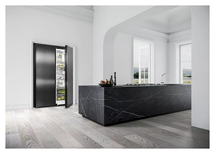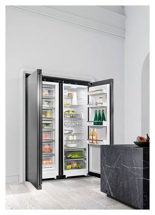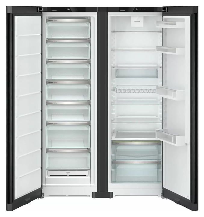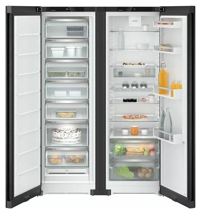 Холодильник Liebherr XRFbd 5220серии Plus типа Side-by-Side предназначен для охлаждения, замораживания, кратковременного и длительного хранения пищевых продуктов и напитков в гостиничных комплексах, офисах, а также домашних условиях. Модель состоит из холодильной камеры SRbdd 5220 справа и морозильной камеры SFNbdd 5227 слева, каждая камера оснащена компрессором, перенавешиваемой распашной дверью, кабелем питания с евровилкой, расположенными за дверью в верхней части фронта сенсорной панелью управления и монохромным жидкокристаллическим дисплеем с белой подсветкой индикации. Боковины выполнены из стали с лакированным покрытием черного цвета, двери – из нержавеющей стали с устойчивой к царапинам и отпечаткам пальцев сатинированной вертикальными штрихами поверхностью BlackSteel оттенка черная сталь, внутренняя облицовка камер – из белого пластика, плоские полки – из прозрачного закаленного стекла, ящики и навесные полки – из белого пластика с прозрачным фронтом, ящики и полки декорированы окантовками серебристого оттенка, упаковка – из гофрокартона, полимерной пленки и полистирола.