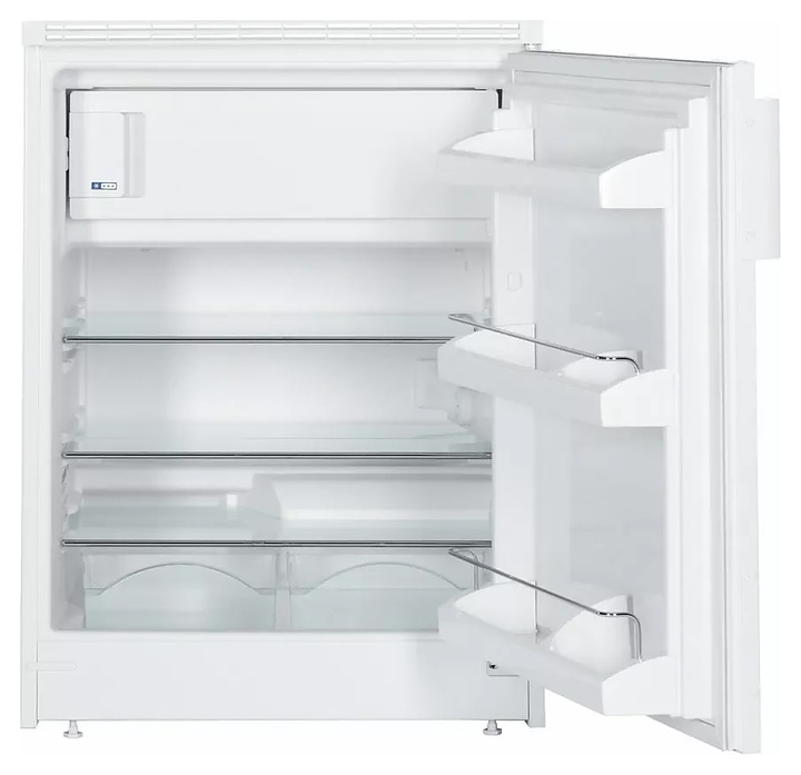 Встраиваемый холодильник Liebherr UK 1524 серии Comfort предназначен для охлаждения, замораживания, кратковременного и длительного хранения пищевых продуктов и напитков в гостиничных комплексах, офисах, а также домашних условиях. Модель оснащена холодильной камерой с интегрированной в нее морозильной камерой сверху с распашной дверцей с вертикальной рукояткой, внешней правосторонней перенавешивамой распашной дверью, кабелем питания с евровилкой и расположенной внутри холодильной камеры электромеханической панелью управления. Боковины и внешняя дверь выполнены из стали с антикоррозийным покрытием белого цвета, внутренняя облицовка камеры – из белого пластика, плоские полки – из прозрачного безопасного закаленного стекла, ящики – из прозрачного пластика, навесные полки с дном из стекла, белой пластмассовой рамой и металлическими ограничителями с хромированной поверхностью, ящики и плоские полки декорированы окантовками серебристого оттенка, упаковка – из гофрокартона, полимерной пленки и полистирола. Комплектация: