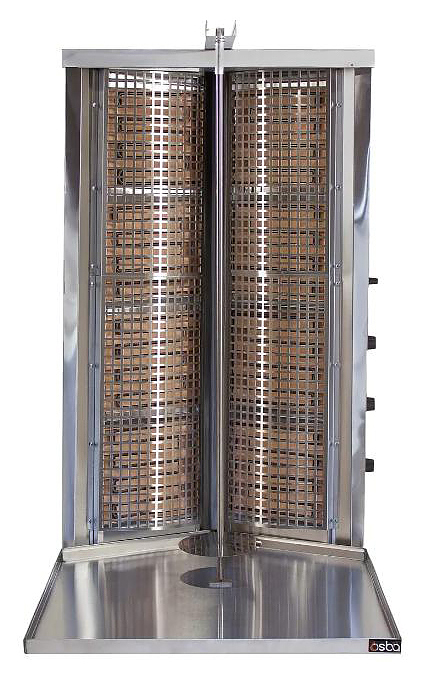 Гриль для шаурмы Osba 3.8K предназначен для обжарки большого количества различных видов мяса и птицы при приготовлении начинки для шаурмы, донера и других блюд на предприятиях общественного питания и торговли. Размещение на вертикальном вертеле и ручное управление вращением обеспечивают равномерное приготовление. Модель оснащена 8 зонами нагрева с 2 уровнями мощности. Решетка на нагревательных элементах гарантирует безопасность и чистоту во время приготовления. Перемещение вертела вперед и назад позволяет регулировать расстояние между мясом и нагревом при разном количестве заготовки. Корпус и решетка выполнены из нержавеющей стали, которая отличается прочностью и долговечностью.