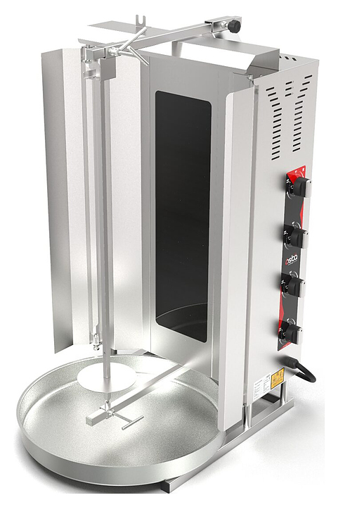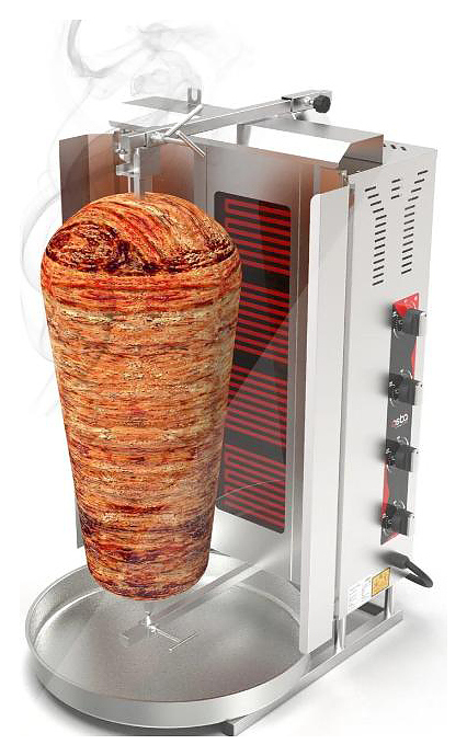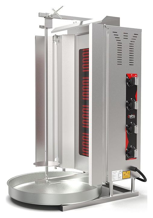 Электрический гриль Osba SD16 предназначен для обжарки большого количества различных видов мяса и птицы при приготовлении начинки для шаурмы, донера и других блюд на предприятиях общественного питания и торговли. Размещение на вертикальном вертеле и ручное управление вращением обеспечивают равномерное приготовление. Модель оснащена защитным козырьком, 4 зонами нагрева, каждая из которых имеет индивидуальное управление с плавной регулировкой мощности. Покрытие на нагревательных элементах гарантирует легкую очистку. Перемещение вертела вперед и назад позволяет регулировать расстояние между мясом и нагревом при разном количестве заготовки. Корпус выполнен из нержавеющей стали, которая отличается прочностью и долговечностью, защита нагревателей - из жаростойкой стеклокерамики.