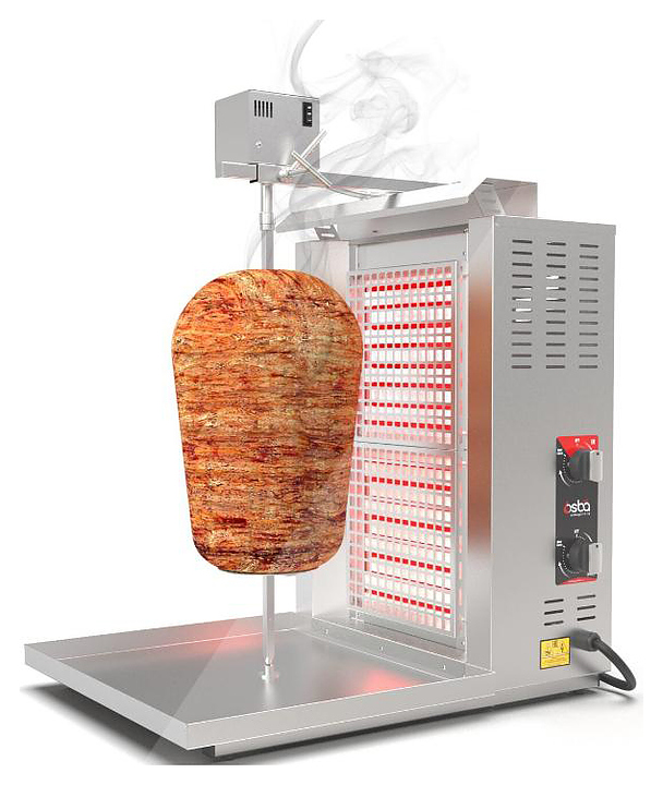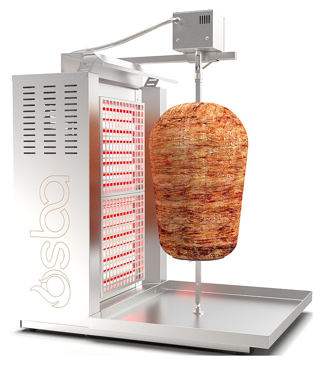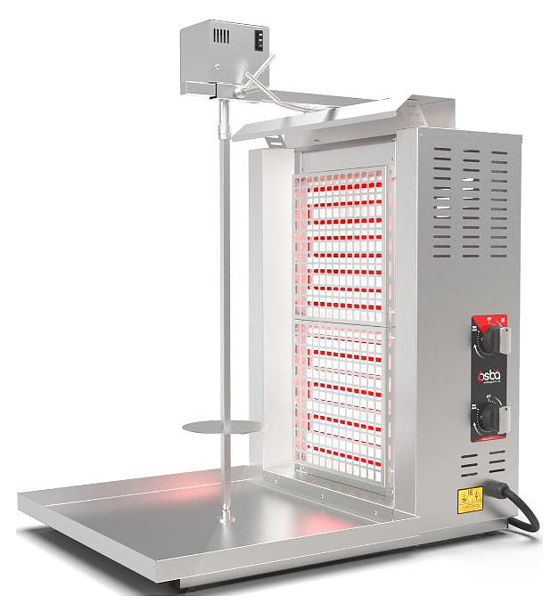 Электрический гриль Osba SH2-LE предназначен для обжарки большого количества различных видов мяса и птицы при приготовлении начинки для шаурмы, донера и других блюд на предприятиях общественного питания и торговли. Размещение на вертикальном вертеле и электрическое управление вращением обеспечивают равномерное приготовление. Модель оснащена защитным козырьком и 2 зонами нагрева, каждая из которых имеет индивидуальное управление с плавной регулировкой мощности. Перемещение вертела вперед и назад позволяет регулировать расстояние между мясом и нагревом при разном количестве заготовки. Корпус и решетка нагревателей выполнены из нержавеющей стали, которая отличается прочностью и долговечностью.