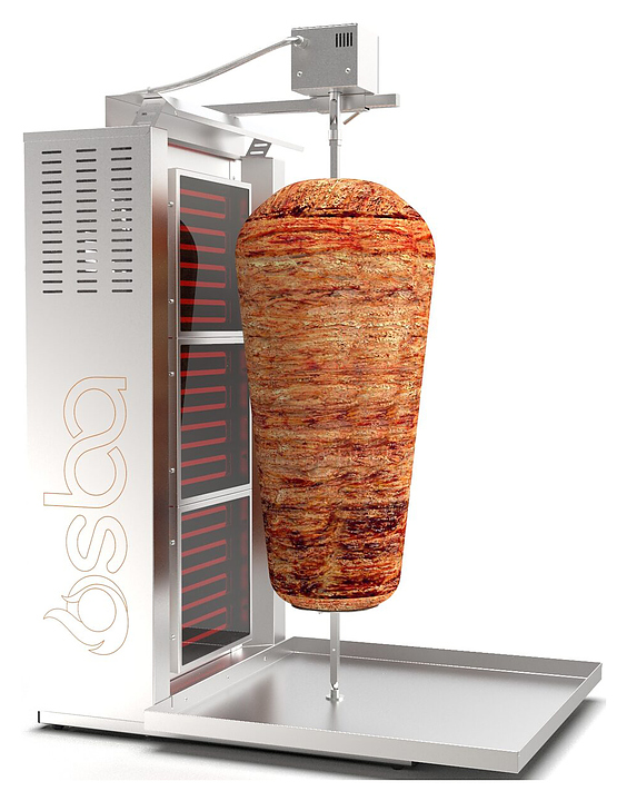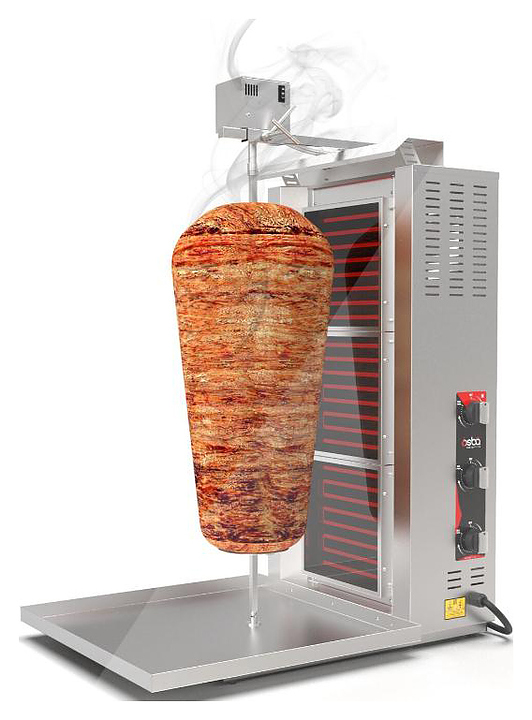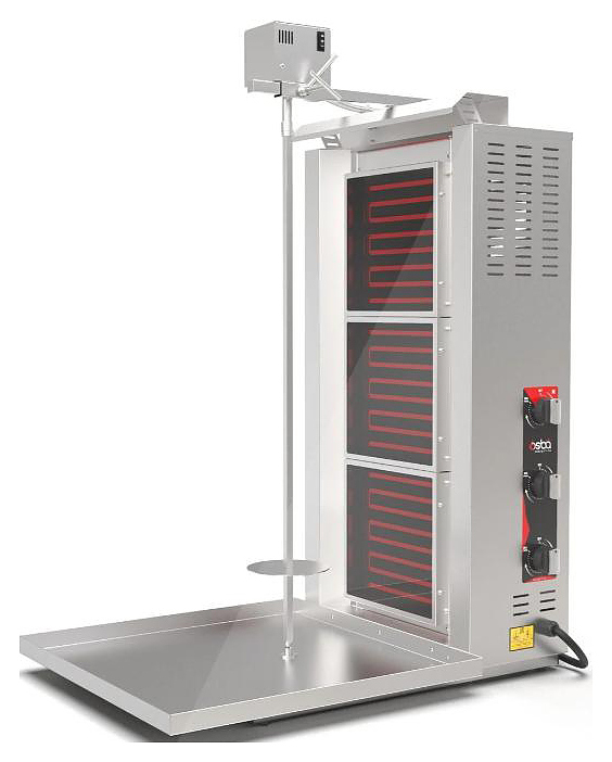 Электрический гриль Osba SH3-CE предназначен для обжарки большого количества различных видов мяса и птицы при приготовлении начинки для шаурмы, донера и других блюд на предприятиях общественного питания и торговли. Размещение на вертикальном вертеле и электрическое управление вращением обеспечивают равномерное приготовление. Модель оснащена защитным козырьком и 3 зонами нагрева, каждая из которых имеет индивидуальное управление с плавной регулировкой мощности. Покрытие на нагревательных элементах гарантирует легкую очистку. Перемещение вертела вперед и назад позволяет регулировать расстояние между мясом и нагревом при разном количестве заготовки. Корпус выполнен из пищевой нержавеющей стали, которая отличается прочностью и долговечностью, защита нагревателей - из жаростойкой стеклокерамики.
