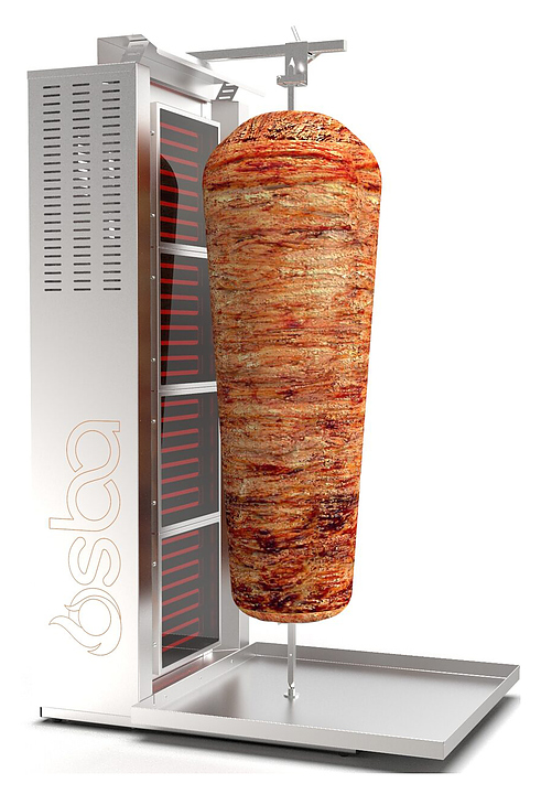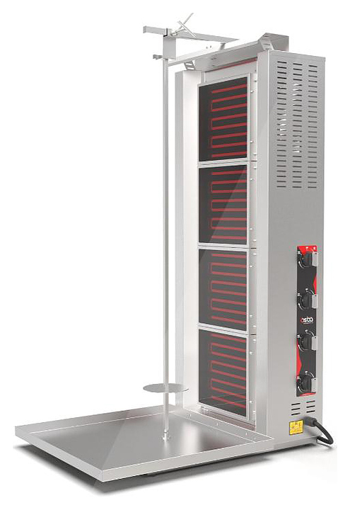 Электрический гриль Osba SH4-C предназначен для обжарки большого количества различных видов мяса и птицы при приготовлении начинки для шаурмы, донера и других блюд на предприятиях общественного питания и торговли. Размещение на вертикальном вертеле и ручное управление вращением обеспечивают равномерное приготовление. Модель оснащена защитным козырьком и 4 зонами нагрева, каждая из которых имеет индивидуальное управление с плавной регулировкой мощности. Покрытие на нагревательных элементах гарантирует легкую очистку. Перемещение вертела вперед и назад позволяет регулировать расстояние между мясом и нагревом при разном количестве заготовки. Корпус выполнен из пищевой нержавеющей стали, которая отличается прочностью и долговечностью, защита нагревателей - из жаростойкой стеклокерамики. Дополнительные характеристики: